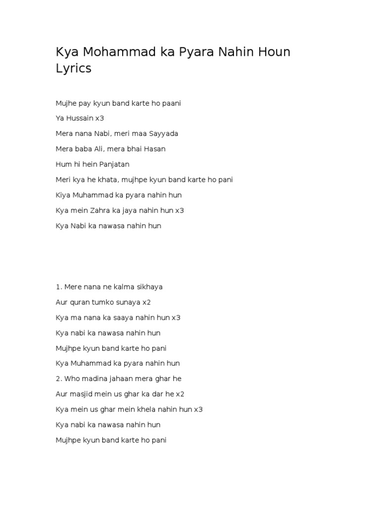Kya mein zahra ka jaya nahin hun x3. Mera nana nabi meri maa sayyada. Mera baba Ali mera bhai Hasan Hum hi hein Panjatan Meri kya he khata mujhpe kyun band karte ho pani Kiya Muhammad ka pyara nahin hun Kya mein Zahra ka jaya nahin hun x3 Kya Nabi ka nawasa nahin hun 1.